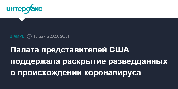 Москва. 10 марта. INTERFAX.RU - Палата представителей Конгресса США единогласно поддержала предложение рассекретить данные американской разведки о происхождении COVID-19, сообщает AP. Соответствующий законопроект одобрили 419 депутатов.