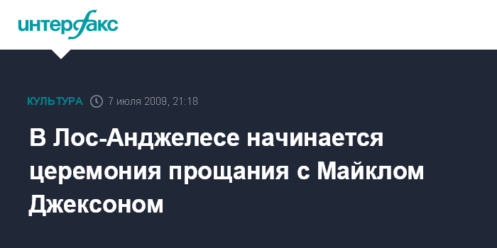 Москва. 7 июля. INTERFAX.RU – В Лос-Анджелесе (Калифорния, США), в спортивно-развлекательном центре Staples Center начинается церемония прощания с Майклом Джексоном, скончавшимся 25 июня в возрасте 50 лет. На самом стадионе, куда уже доставлен гроб с телом певца, собрались 11 тыс. человек, желающих проститься с королем поп-музыки. Забиты поклонниками музыканта и близлежащие улицы.