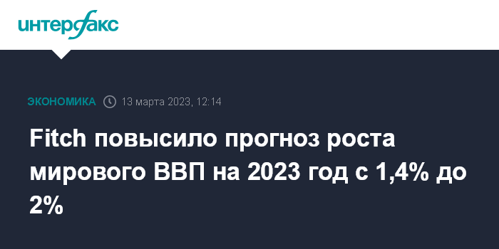 Москва. 13 марта. INTERFAX.RU - Международное рейтинговое агентство Fitch повысило прогноз роста мировой экономики на 2023 год, отметив в качестве позитивных факторов снятие ковидных ограничений в Китае, существенное ослабление газового кризиса в Европе, а также неожиданную устойчивость потребительского спроса в США.