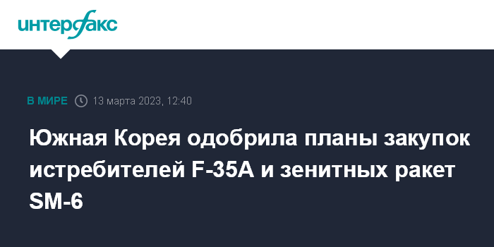 Москва. 13 марта. INTERFAX.RU - Национальное управление оборонных закупок (DAPA) Южной Кореи поддержало планы приобрести дополнительные истребители-бомбардировщики F-35A и зенитные ракеты SM-6 морского базирования, сообщает в понедельник Yonhap.