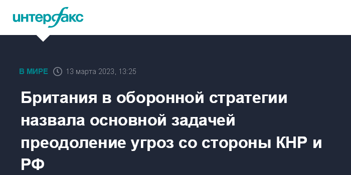 Москва. 13 марта. INTERFAX.RU - Противодействие угрозам со стороны Китая и России является основной задачей властей Великобритании в сфере обороны, говорится в обновленной британской оборонной стратегии от 2023 года (IR23).