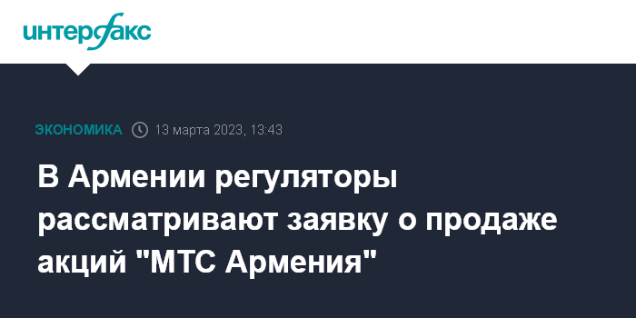 Москва. 13 марта. INTERFAX.RU - Компания "МТС Армения" (бренд Viva-MTS), дочерний оператор российского ПАО "МТС", обратилась в Комиссию по регулированию общественных услуг (КРОУ) Армении для получения разрешения на продажу акций. Как сказала "Интерфаксу" пресс-секретарь КРОУ Лиана Азизян, заявление компании рассматривается.