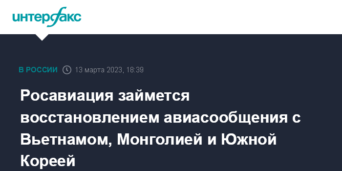 Москва. 13 марта. INTERFAX.RU - Росавиация в 2023 году будет работать над возобновлением авиасообщения с Вьетнамом, Монголией, Южной Кореей и Саудовской Аравией, говорится в докладе главы ведомства Александра Нерадько к итоговому заседанию коллегии Росавиации. Доклад опубликован на сайте ведомства.