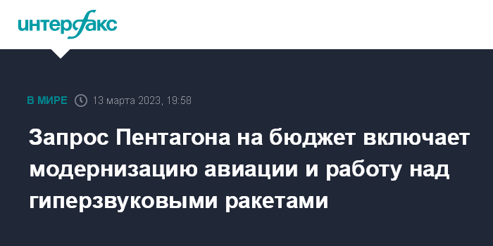 Москва. 13 марта. INTERFAX.RU - Пентагон, запрашивая $842 млрд на оборонные нужды на 2024 финансовый год, планирует, в частности, продолжить модернизацию боевой авиации, а также разработку и закупку гиперзвуковых ракет, говорится в сообщении, распространенном в понедельник оборонным ведомством США.