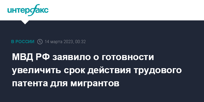 "Об этом говорится в письме в адрес уполномоченного за подписью заместителя министра Андрея Храпова. МВД, по словам Храпова, "готово сократить срок выдачи патента с 10 до 5 дней, одновременно увеличив период его действия при условии соблюдения всех необходимых требований в рамках миграционного контроля", - сказала представитель Титова.