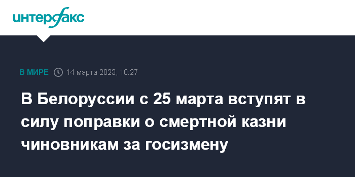Москва. 14 марта. INTERFAX.RU - В Белоруссии с 25 марта вступят в силу поправки в кодексы об уголовной ответственности, предусматривающие смертную казнь чиновникам и военнослужащим за госизмену, а также уголовную ответственность за пропаганду терроризма и дискредитацию армии.