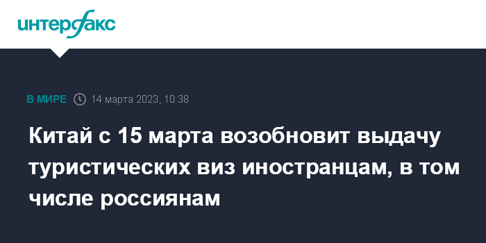 "Консульства Китая за границей возобновят выдачу всех категорий виз иностранцам, начиная со среды, 15 марта. Решение принято для дальнейшего облегчения пересечения границы", - говорится в сообщении, размещенном во вторник в сети WeChat.