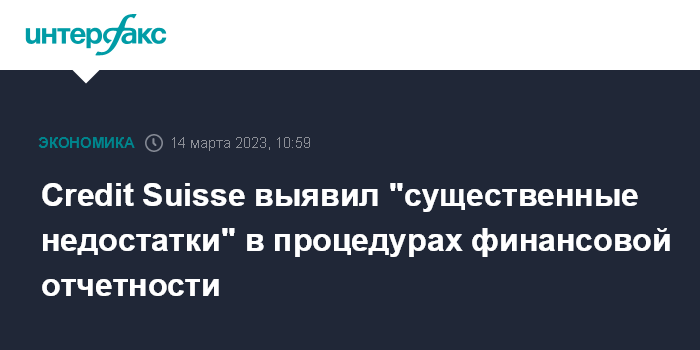 Москва. 14 марта. INTERFAX.RU - Credit Suisse Group AG выявил "существенные недостатки" в процедурах отчетности за 2021 и 2022 финансовые годы и намерен принять меры для их исправления.