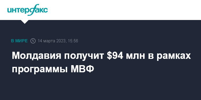 Москва. 14 марта. INTERFAX.RU - Молдавия получит $94 млн в рамках программы МВФ. Об этом заявил возглавляющий обзорную миссию МВФ в Молдавии Рубен Атоян на совместной пресс-конференции с премьер-министром Молдавии Дорином Речаном.