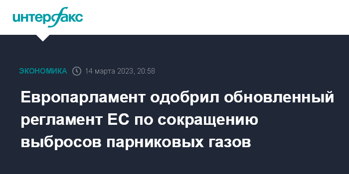 Москва. 14 марта. INTERFAX.RU - Европейский парламент утвердил на пленарной сессии в Страсбурге обновленный регламент ЕС о распределении усилий по снижению максимально допустимого уровня выбросов парниковых газов в государствах-членах союза.