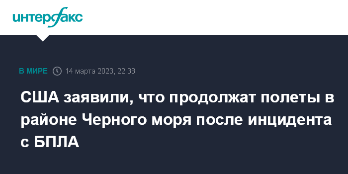 Москва. 14 марта. INTERFAX.RU - США намерены продолжать выполнять полеты военной авиации в районе Черного моря, несмотря на инцидент с беспилотником, заявил во вторник представитель Совета национальной безопасности Белого дома Джон Кирби.