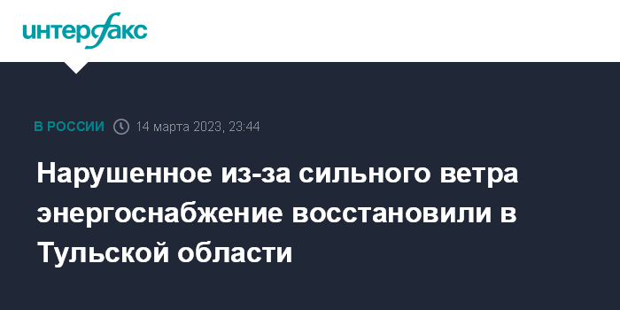 Москва. 14 марта. INTERFAX.RU - Завершены работы по восстановлению электроснабжения в четырех районах Тульской области, нарушенного шквалистым ветром, сообщила во вторник пресс-служба "Тулэнерго".