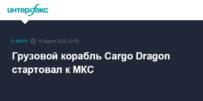 Москва. 15 марта. INTERFAX.RU - Многоразовый грузовой космический корабль Cargo Dragon компании SpaceX стартовал к Международной космической станции (МКС), сообщило NASA.