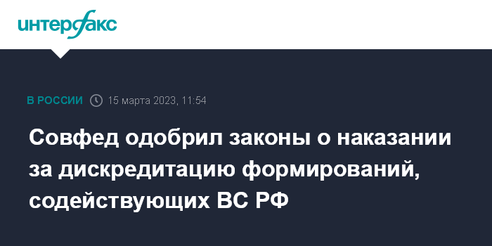 Москва. 15 марта. INTERFAX.RU - Совет Федерации проголосовал за законы об уголовной и административной ответственности за дискредитацию добровольческих формирований и организаций, содействующих Вооруженным силам РФ, и за фейки о них.