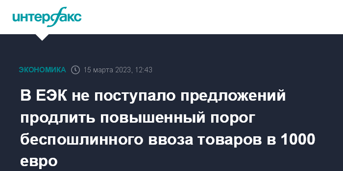 Москва. 15 марта. INTERFAX.RU - Страны-участницы Евразийского экономического союза (ЕАЭС) на текущий момент не направляли предложения о продлении действия повышенного в прошлом году до 1 тыс. евро порога беспошлинного ввоза товаров на территорию союза, сообщила на брифинге помощник председателя Евразийской экономической комиссии (ЕЭК) Ия Малкина.