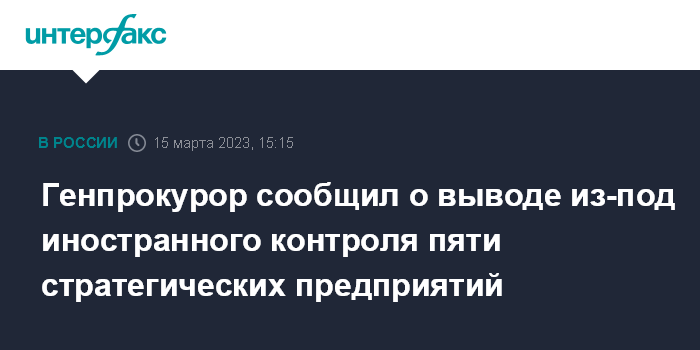 Москва. 15 марта. INTERFAX.RU - Генпрокурор Игорь Краснов сообщил о выводе из-под иностранного контроля по решению суда пяти российских стратегических предприятий, еще четыре ожидают своей очереди, их дела находятся на рассмотрении. Он заявил об этом на коллегии надзорного ведомства по итогам 2022 года.