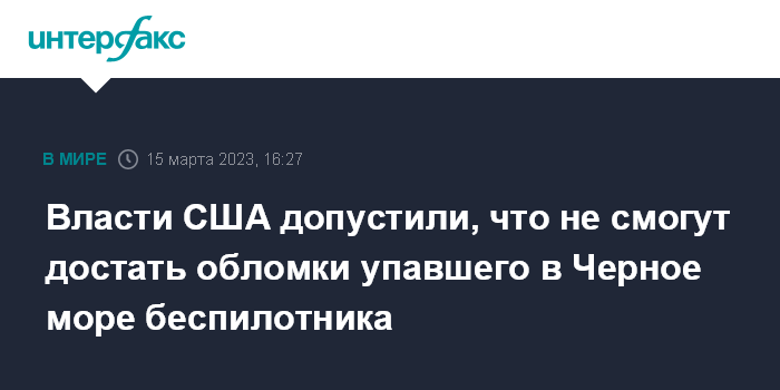 Москва. 15 марта. INTERFAX.RU - Представитель Совета национальной безопасности США Джон Кирби заявил, что обломки беспилотника MQ-9 Reaper, упавшего накануне в Черное море, возможно, уже никогда не удастся извлечь на поверхность.