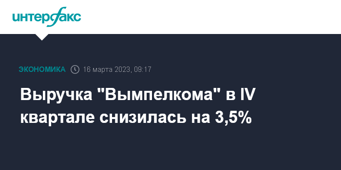 Москва. 16 марта. INTERFAX.RU - Выручка ПАО "Вымпелком" в IV квартале 2022 года составила 74,73 млрд рублей, сократившись на 3,5% по сравнению с аналогичным периодом 2021 года, говорится в сообщении компании.