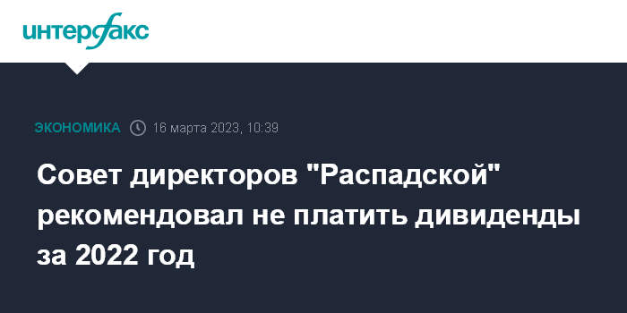 Москва. 16 марта. INTERFAX.RU - Совет директоров "Распадской" решил не рекомендовать годовому собранию акционеров выплату дивидендов по результатам 2022 года, сообщила компания.
