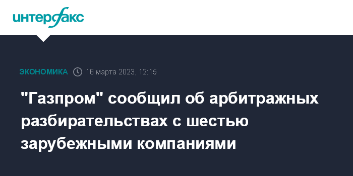НАК "Нафтогаз Украины" направил просьбу об арбитраже против ПАО "Газпром" в Международный арбитражный суд Международной торговой палаты. "Нафтогаз" требует оплаты неоказанных им услуг по соглашению об оказании услуги по организации транспортировки природного газа через территорию Украины от 30 декабря 2019 г. 27 сентября "Газпром" направил письма с возражениями по компетенции арбитража рассматривать требования НАК ввиду коренного изменения обстоятельств. 15 февраля 2023 года в "Газпром" поступило уведомление от секретариата МТП о решении Международного арбитражного суда Международной торговой палаты разрешить рассмотрение дела по существу арбитражным трибуналом. На текущий момент у "Газпрома" отсутствует информации о формировании состава арбитражного трибунала, пишет "Газпром".