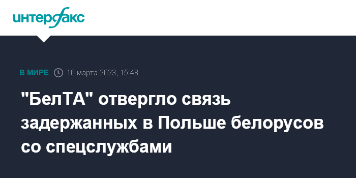 Москва. 16 марта. INTERFAX.RU - Белорусское госинформагентство "БелТА" в Telegram назвало фейком информацию польских СМИ о том, что в Польше по подозрению в шпионаже на Россию были задержаны в том числе граждане Белоруссии. Польские чиновники ранее подтвердили задержание подозреваемых, но не назвали их имена.