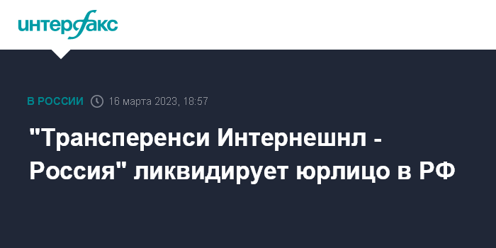 Москва. 16 марта. INTERFAX.RU - Руководство центра "Трансперенси Интернешнл - Россия" (признан в РФ иноагентом) приняло решение о ликвидации российского юридического лица после признания Генпрокуратурой РФ международного движения Transparency International нежелательной организацией, сообщила в четверг пресс-служба центра.