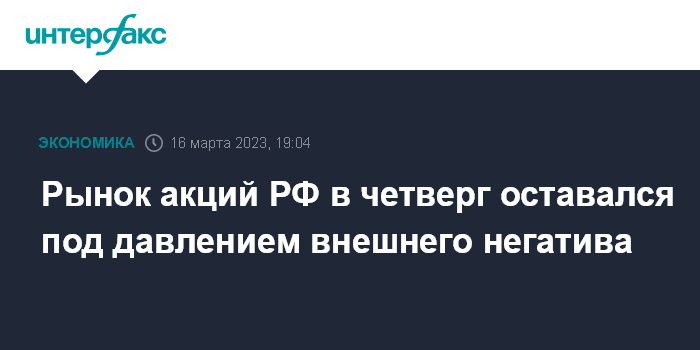 Москва. 16 марта. INTERFAX.RU - Рынок акций РФ в четверг оставался под давлением продавцов на фоне негативных сигналов с внешних площадок из-за опасений расширения банковского кризиса в мировых экономиках, что может привести к рецессии. Откат индекса МосБиржи сдерживался ослаблением рубля и наметившейся коррекцией мировых площадок вечером в четверг; лидировали в снижении бумаги Polymetal (-3,4%) после рекомендаций менеджмента компании не выплачивать дивиденды за прошлый год.