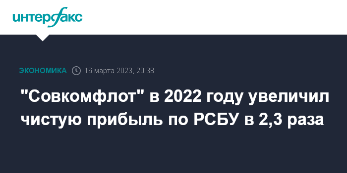 Москва. 16 марта. INTERFAX.RU - Чистая прибыль ПАО "Совкомфлот" (СКФ) по РСБУ за 2022 год выросла в 2,3 раза, до 13,9 млрд руб., следует из отчетности компании.