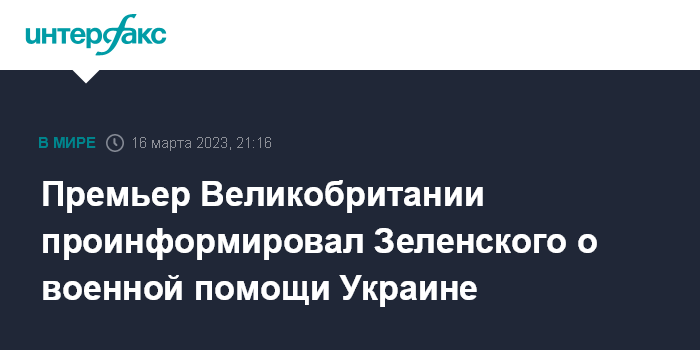 Москва. 16 марта. INTERFAX.RU - Премьер-министр Великобритании Риши Сунак провел телефонный разговор с президентом Украины Владимиром Зеленским и проинформировал его о ходе поставок британской военной помощи, говорится в заявлении, распространенном в четверг на Даунинг-стрит.