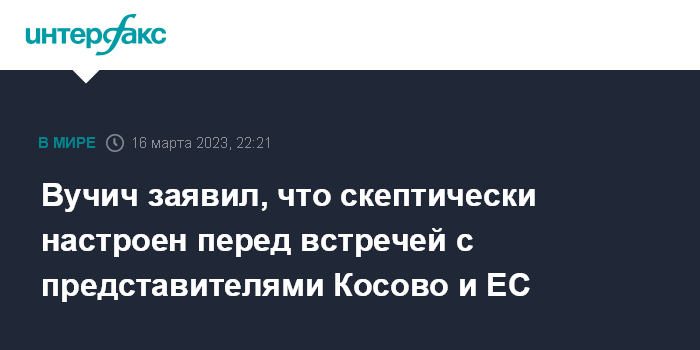 Москва. 16 марта. INTERFAX.RU - Президент Сербии Александр Вучич сообщил, что не ждет ничего судьбоносного от встречи в субботу в Охриде (Северная Македония), в которой также примут участие премьер косовского правительства Альбин Курти и глава европейской дипломатии Жозеп Боррель.