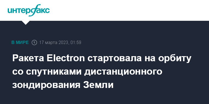 Москва. 17 марта. INTERFAX.RU - Американская ракета легкого класса Electron в пятницу по московскому времени стартовала на орбиту с двумя коммерческими спутниками радиолокационной съемки Земли Capella-9 и Capella-10, сообщила компания-разработчик носителя Rocket Lab.