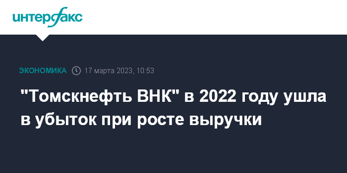 Москва. 17 марта. INTERFAX.RU - АО ""Томскнефть" ВНК" (на паритетных началах принадлежит ННК и "Газпром нефти") по итогам 2022 года получило 18,7 млрд рублей чистого убытка по РСБУ против 4 млрд рублей чистой прибыли годом ранее, говорится в ее отчетности.