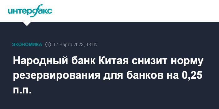 Москва. 17 марта. INTERFAX.RU - Народный банк Китая (НБК) объявил о снижении норматива обязательных резервов для банков для поддержания ликвидности на достаточном уровне, а также лучшего обеспечения финансами ключевых отраслей и стимулирования экономического роста. Об этом сообщает "Синьхуа".
