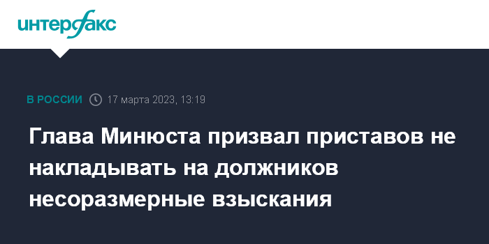 Москва. 17 марта. INTERFAX.RU - Министр юстиции РФ Константин Чуйченко потребовал от Федеральной службы судебных приставов (ФССП) прекратить практику применения к должникам мер, значительно превышающих сумму долга.