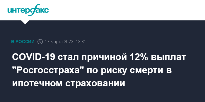 Москва. 17 марта. INTERFAX.RU - Более 12% выплат за последние четыре года в сегменте ипотечного страхования СК "Росгосстрах" по риску "смерть" приходятся на COVID-19, сообщила страховая компания.