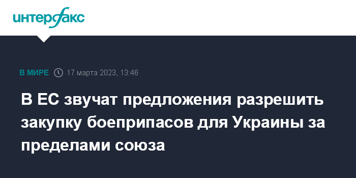 Москва. 17 марта. INTERFAX.RU - Ряд стран ЕС желают приобретать боеприпасы для Украины за пределами блока, если Евросоюз не сможет их производить достаточно много и быстро на своих предприятиях, сообщает в пятницу Euractiv.