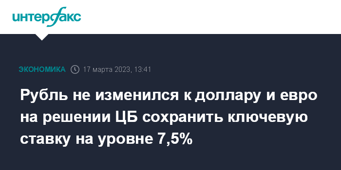 Москва. 17 марта. INTERFAX.RU - Рубль не изменился к доллару и евро на Московской бирже в пятницу днем на решении ЦБ РФ сохранить ключевую ставку на уровне 7,5%, так как оно уже было учтено рынком.