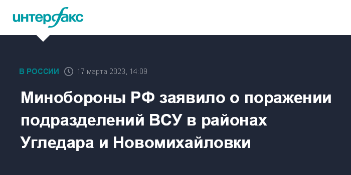 Москва. 17 марта. INTERFAX.RU - Подразделения вооруженных сил Украины поражены в районах Угледара и Новомихайловки Донецкой народной республики, сообщил официальный представитель министерства обороны РФ Игорь Конашенков на брифинге в пятницу.
