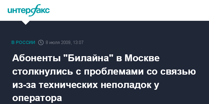 Москва. 8 июля. INTERFAX.RU - Десятки тысяч абонентов "Билайна" столкнулись со сложностями со связью в среду из-за технических проблем у оператора сотовой связи. Как рассказали "Интерфаксу" в службе клиентской поддержки, "у компании возникли проблемы "технического плана", которые будут устранены во второй половине дня".
