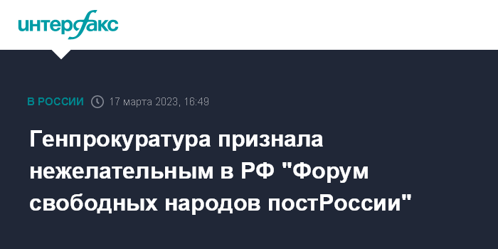 Москва. 17 марта. INTERFAX.RU - Генеральная прокуратура РФ признала нежелательным в РФ общественное движение "Форум свободных народов постРоссии" (Free Nations of PostRussia Forum), сообщили "Интерфаксу" в пресс-службе ведомства.