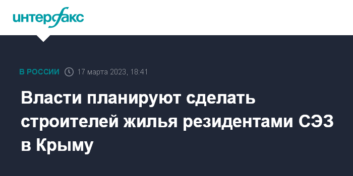 Москва. 17 марта. INTERFAX.RU - Строители жилья могут стать резидентами свободной экономической зоны (СЭЗ) в Крыму, заявил на совещании у президента вице-премьер Марат Хуснуллин.
