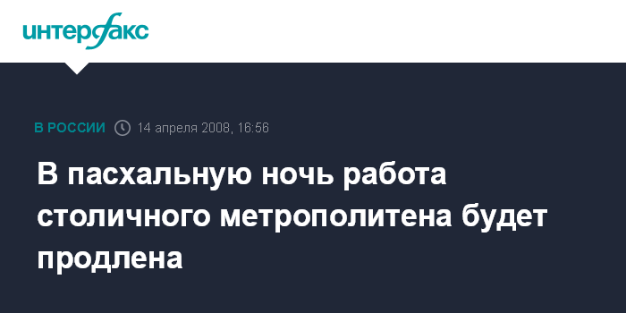 Москва. 14 апреля. INTERFAX.RU - В связи с празднованием православной Пасхи работа московского метрополитена в ночь с 26 на 27 апреля будет продлена до 02:30, сообщили "Интерфаксу" в пресс-службе столичной подземки в понедельник.