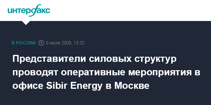 Москва. 8 июля. INTERFAX.RU - Представители силовых структур проводят оперативные мероприятия в офисе Sibir Energy в Москве, сообщил Агентству нефтяной информации (АНИ) источник, близкий к компании.