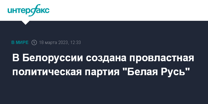 Москва. 18 марта. INTERFAX.RU - Провластную партию "Белая Русь" учредили в Белоруссии в субботу. Решение принято на учредительном съезде партии в Минске, сообщили в пресс-службе верхней палаты белорусского парламента - Совета Республики.