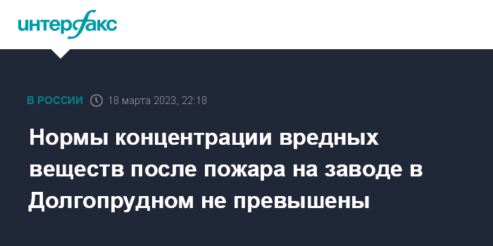 "По данным ближайших постов наблюдения за качеством атмосферного воздуха Долгопрудный-3 (Долгопрудный, ул. Советская, д. 5Б), Химки-4 (Химки, мкр. Левобережный, ул. Совхозная, д. 16 стр. 5), Химки-5 (Химки, ул. Германа Титова, стр. 16) и АСКЗА (Автоматическая система контроля загазованности атмосферы) "Долгопрудный" (Долгопрудный, ул. Спортивная, 2), АСКЗА "Химки" (Химки, пр-т Ленинский, 7), расположенных на расстоянии 1,5 - 5,0 км, превышений установленных нормативов не зафиксировано", - сказал собеседник агентства.