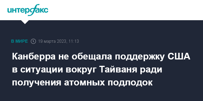 Москва. 19 марта. INTERFAX.RU - Власти Австралии не давали обещаний США поддержать их в случае военного конфликта вокруг Тайваня в обмен на получение атомных подводных лодок (АПЛ) в рамках партнерства AUKUS, заявил в воскресенье телеканалу ABC австралийский министр обороны Ричард Марлз.