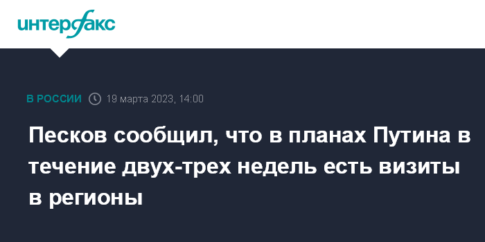 Москва. 19 марта. INTERFAX.RU - У президента РФ Владимира Путина в планах на ближайшие две-три недели есть поездки в российские регионы, сообщил в воскресенье пресс-секретарь главы государства Дмитрий Песков.