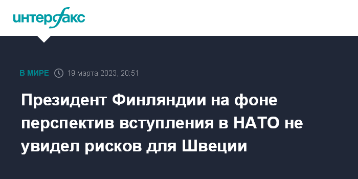 Москва. 19 марта. INTERFAX.RU - Финский президент Саули Ниинистё не считает, что Швеция столкнется с проблемами в сфере безопасности, если Финляндия раньше нее вступит в НАТО, сообщает в воскресенье Associated Press (AP).