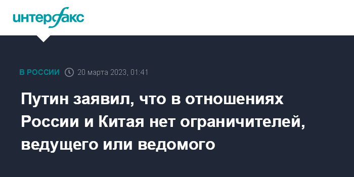Москва. 20 марта. INTERFAX.RU - Отношения Москвы и Пекина превосходят военно-политические союзы времен "холодной войны", в них нет ограничителей, ведущего или ведомого, написал президент РФ Владимир Путин в своей статье "Россия и Китай - партнерство, устремленное в будущее" в китайском издании "Жэньминь Жибао".