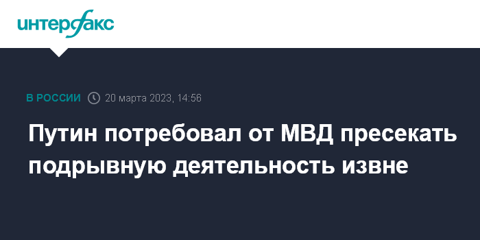 Москва. 20 марта. INTERFAX.RU - Президент Владимир Путин потребовал от МВД пресекать любые попытки противников России и их агентуры раскачать общество изнутри. Он заявил об этом на итоговой коллегии ведомства.